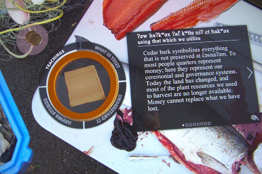 ʔeləw̓k ̓ʷ Belongings enables museum visitors to explore the continuity of Musqueam culture through interactions with replicas of “belongings" excavated from c̓əsnaʔəm, as well as contemporary objects that are a part of everyday Musqueam life. Through tangible interaction, visitors are presented opportunities to directly experience intangible elements of Indigenous culture, such as values, as well as access information about the long history of salmon fishing and the continuity of related knowledge at c̓əsnaʔəm. ʔeləw̓k ̓ ʷ Belongings was on exhibition for a year at the Museum of Anthropology, UBC, Vancouver, Canada.