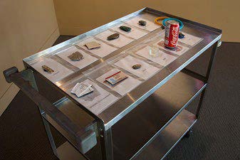 ʔeləw̓k̓ʷ | Belongings at cə̓snaʔəm Exhibition (Museum of Anthropology, UBC, Vancouver). Interactive tabletop with tangible artifact in activation ring (left, centre), and tangible “belongings" input objects on museum cart (right).