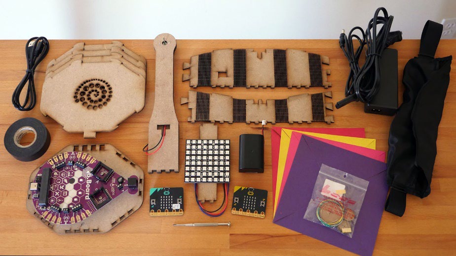 BITalino piezoelectric respiration sensor, Adafruit Huzzah microprocessor board, plastic pulleys, laser cut birch plywood, origami paper, elastic band, Adafruit Motor Featherwing, DC motor, 8 bit RGB LED matrix, misc. electronic components and breadboards, custom stretch respiration sensor, open source B.Board microprocessor & prototyping platform, PDF assembly guide and videos.